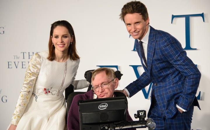 "Stephen Hawking and Actors Eddie Redmayne and Felicity Jones As They Arrive at the UK Premiere of the Film ‘The Theory of Everything’ (Photo: Reuters)" — Taken from The Telegraph via Google Images