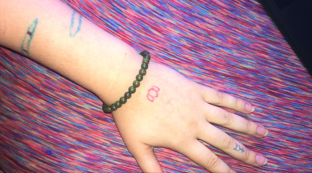 More than a year has passed since this interaction. I visited Eie at her rehab center. The bus ride back to the bay stank of toilet sewers and I kept my nose buried in a swatch of fabric scented with lavender oil. Eie is more than a year sober now and is doing great. I left the abusive relationship I had entered after we stopped talking. Now I have a healthy partnership, my own apartment, and am going back to school with plans to join the health care industry and help other people get through their own metaphysical problems. I am getting a tattoo gun soon to continue drawing inspiring symbols on skin to help us reclaim our bodies and appreciate the abundant bounty earth and life have to offer.