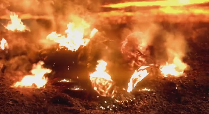 After Obi-Wan cuts off Anakin’s legs and arms, what remains of the former Jedi goes up in flames. Staring out with red-yellow eyes he yells his “I hate you” at his former master, a scene that is one of the most intense of the whole saga. But maybe even more disturbing is Obi-Wan’s reaction to this. He just turns and walks away. If he really loved Anakin, as he had said moments earlier, he should have killed him, and put his former Padawan out of his misery.
