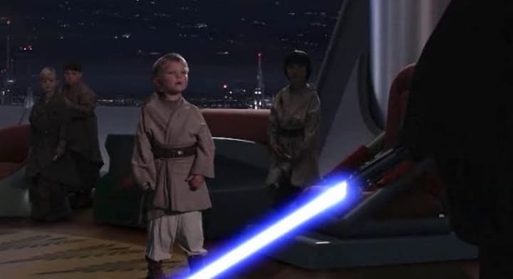 This scene from Revenge of The Sith happens a little before the battle on Mustafar. Anakin arrives at the Jedi Temple, where he is met by frightened younglings and Padawans, who thought that he will lead them to safety. While the final movie does not actually show Anakin’s dark deeds after he ignites his lightsaber, there apparently was a scene that showed his killings, but was later cut for being too gruesome. The ignition of the blue blade is enough to start a disturbing inner cinema.