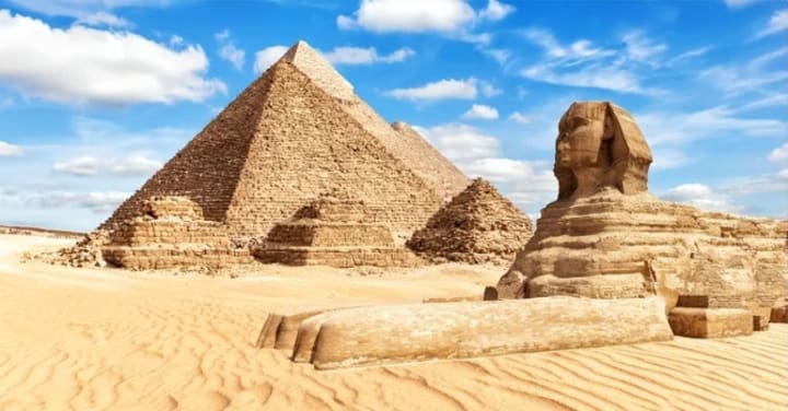 The sphinx is located in the pyramid complex of the Giza plateau, with a human face, but with a lion's body, two eyes staring forward, and a solemn expression. And like the pyramids around it, the sphinx is a huge thing, about 74 meters long, 19 meters wide, and 20 meters high, with a face that is 5 meters wide and two ears that are 2 meters long.