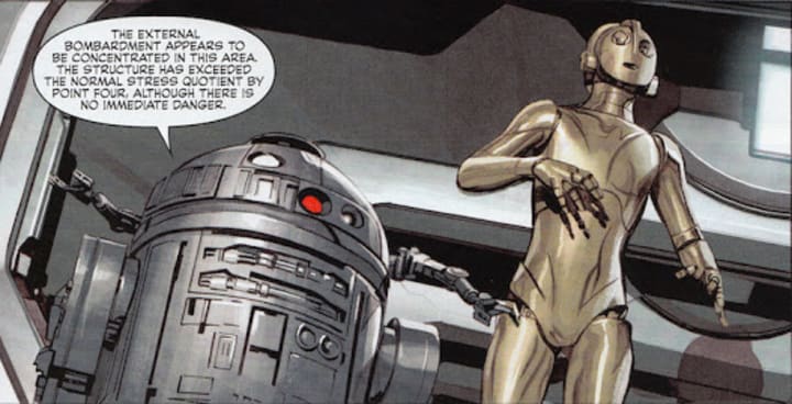 Films go through various drafts and ideas. It is important to remember that, and A New Hope out of any of the Star Wars films was the film with the most versions of itself, going through iteration after iteration. Characters like Anakin and Darth Vader were separate, Skywalker was Starkiller, and the Emperor was just some regular dude. R2-D2 talking was one of these many ideas. However, in many aspects, the character remains the same. His role in the actual story is mostly just remarking on what’s going on, and in some iterations of the script, the main heroes don’t even bother to meet the droids until later on in the movie. A reversal of what would eventually happen in A New Hope, where we follow the droids from the very beginning of the movie. He does still manage to maintain a lot of the droid's spunk, especially his witty banter with the early versions of C-3PO. Mostly just small insults and other things. Although sometimes the dialogue comes off as quite long-winded, once calling Threepio a philosopher, although not as a complement.