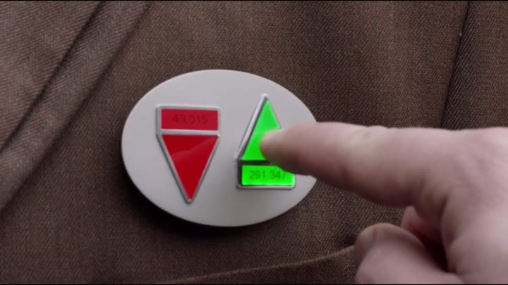 In the episode Majority Rule, the Orville crew visits the planet Sargus 4 to investigate the missing anthropologists who came to observe and study the planet. Sargus 4 resembles a 21st century Earth complete with Earth looking humans. One peculiar detail of the Sargus 4 society is that everyone is wearing a voting badge. These badges give citizens the option to give you an up vote or a down vote depending on an individual's actions in the community. Or for no reason at all as you see when the character LaMarr receives an up vote from a random barista who finds him attractive. The same barista then kicks a woman out of her coffee shop for having over 500,000 down votes as the coffee shop does not serve people with that many down votes. Which indicates that this society runs on a social currency where your votes dictate how other people will treat you.
