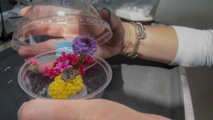 "We tried different solutions and the adults do seem to like Gatorade. For the larvae, they feed on the host plant where the adults lay their eggs," Howorth says, of the Cleveland's Horkelia leaves, a flowering perennial herb the team line in each of the larvae incubation cups.