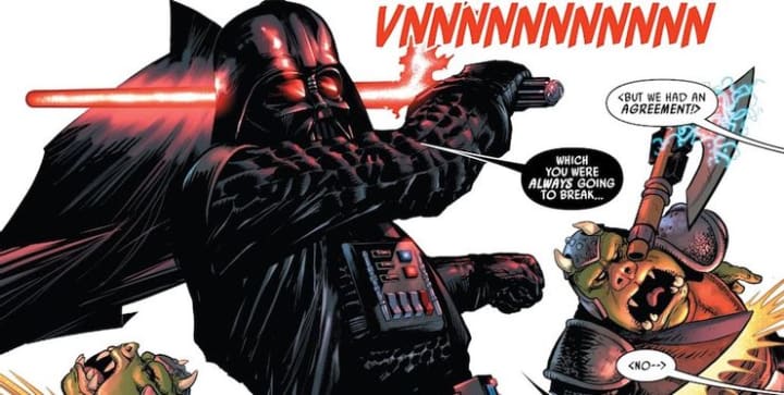Despite his clear willingness to take over, fans can see throughout the franchise that, even though the Dark Lord works alongside many bounty hunters and Imperial Admirals, Vader is simply not a good ally to have. Shown in Darth Vader #17, Vader has made a deal with Bokku, a member of the Grand Hutt Council, to bid against Jabba in the auction for the carbon-frozen Han Solo held by Crimson Dawn. True to form, Vader later appears on the Hutt flagship, killing everyone on board, claiming that Bokku was always going to betray him.
