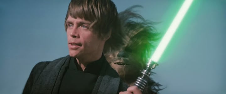 In A New Hope and The Empire Strikes Back, lightsabers were presented as either blue or red. Obi-Wan Kenobi's lightsaber had a blue blade, which became associated with the Jedi, as did the one that he gave to Luke Skywalker. Darth Vader, however, had a red lightsaber, which then became forever associated with the Sith. This all changed in Return of the Jedi when Luke Skywalker had built himself a new lightsaber. His new lightsaber broke away from the established color standard that everyone had come to expect as this one was green. However, all of the original posters and promotional material for Return of the Jedi had Luke Skywalker using the traditional blue-bladed lightsaber. Luke Skywalker's blue lightsaber even made it into the trailers. Based on this you can imagine the audience’s surprise when the actual film had Luke Skywalker using a green-bladed lightsaber rather than a blue one.