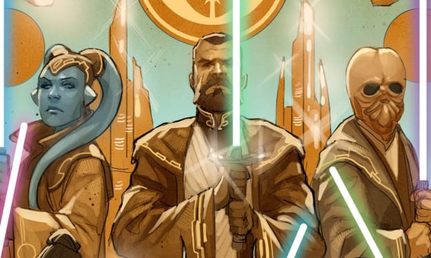 The art here is very beautiful. It showcases the lineage of the Skywalkers, both by blood and in a spiritual sense. Rey was not a Skywalker by blood, but she carries on the spirit of the family, hence her adopting the Skywalker name at the (alleged) end of the saga. This moment at the end was a sticking point for some fans and became a hilarious meme, but I actually have no problem with Rey adopting the name, as it is something I had been wanting for a long time.