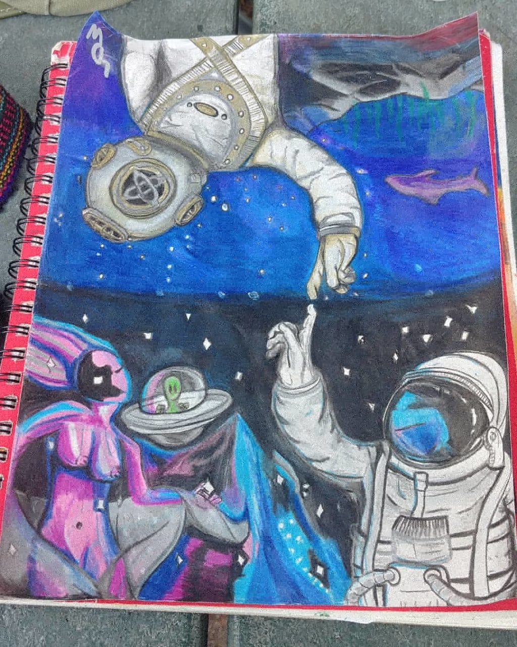 The mysteries are just two things that I really find significant in my life. Deep space has been very little traveled and discovered just like the ocean. The astronaut dances with the galaxies as if she's a beautiful woman. He looks at her because he knows he can't have her. And the diver doesn't know that the shark behind him is also what he's been wanting, a way out. These two things are relevant issues in today's exploration of the beyond. It's always been a dream of ours and we've already gotten started, but there's so much more to search and discover. Allow your self to be open-minded and creative. Making this drawing for my friend really allowed me to open my mind up even more to the ideas of the unknown. I complete the flow between them because they're both a sort of seemingly endless darkness. Without these two mysteries, we truly wouldn't know what we would do with ourselves. This is our challenge that we were given and now it's our turn to figure out what truly lies beyond us and beneath us.