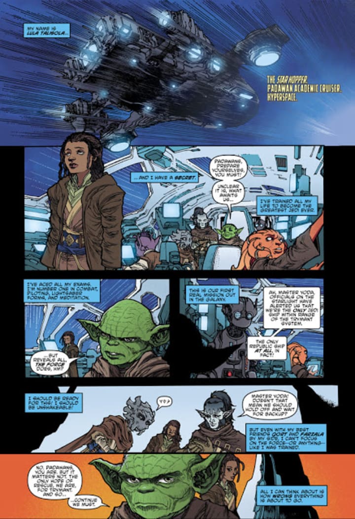 Luckily, the Star Hopper, a “Padawan Academic Cruiser,” is able to respond to the distress call. The Jedi Master teaching these Padawans is none other than Yoda. But this Yoda actually looks quite different than the one whom we are accustomed to seeing. He is not bent over and using a cane; he is shown standing straight and at attention. This Yoda looks more like a great warrior (though as he famously said in The Empire Strikes Back, “wars not make one great”). The artist, Harvey Tolibao, went to great lengths to show that this is a younger, less weathered Yoda, and in some ways it works. In others, it’s distracting, because you know this is supposed to be Yoda, but he looks so different from all we’ve ever seen of him.