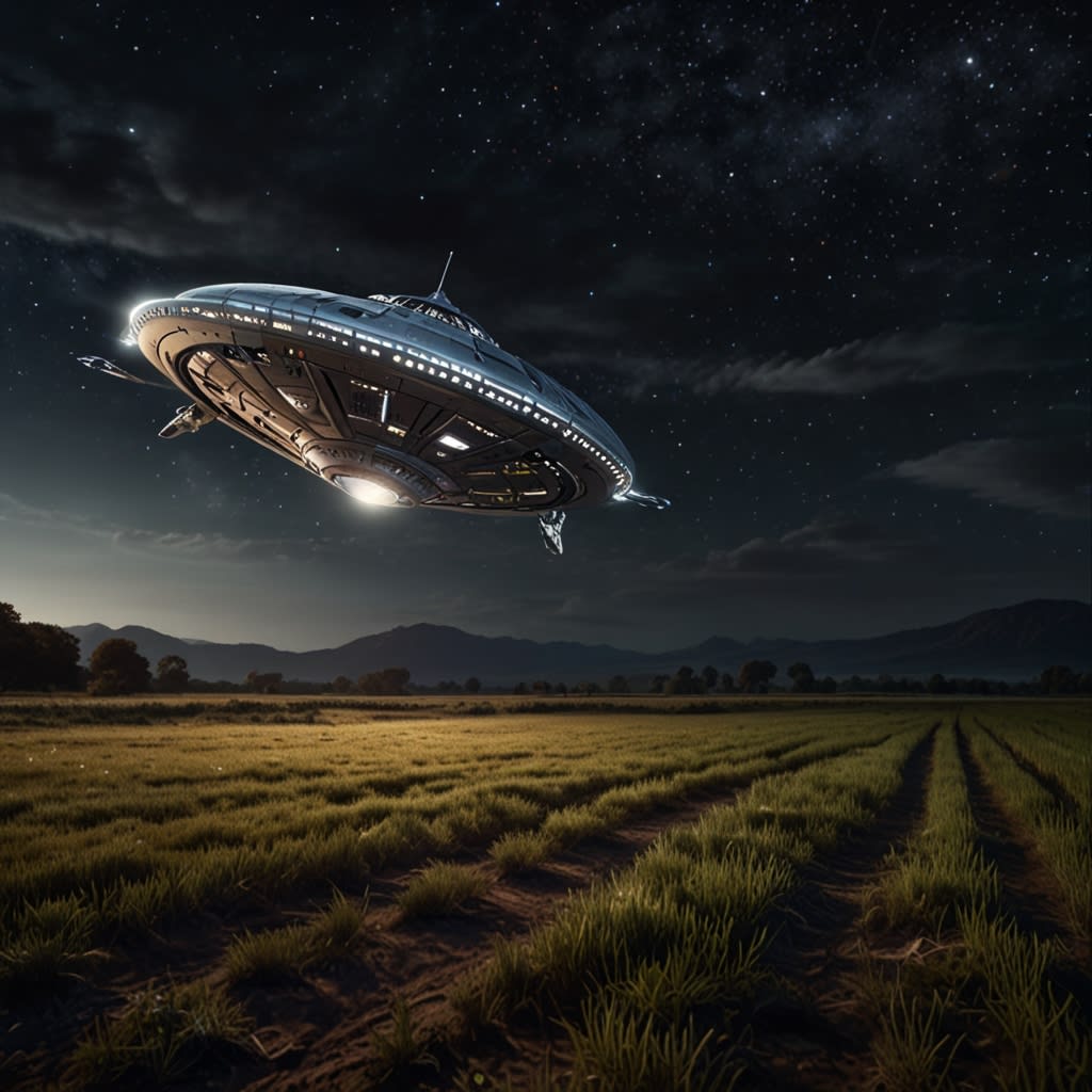 A few miles outside of town, in a secluded field, a shimmering, silver spacecraft descended gently to the ground. The craft was sleek and otherworldly, with an iridescent surface that reflected the moonlight. As it landed, a soft hum filled the air, and a hatch slowly opened. Out stepped an alien being, tall and slender, with luminescent skin that seemed to glow from within. Its eyes were large and expressive, filled with curiosity and wisdom.