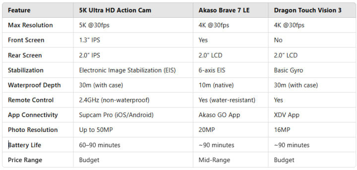 📸 Feature Comparison: 5K Cam vs Other Budget Action Cams