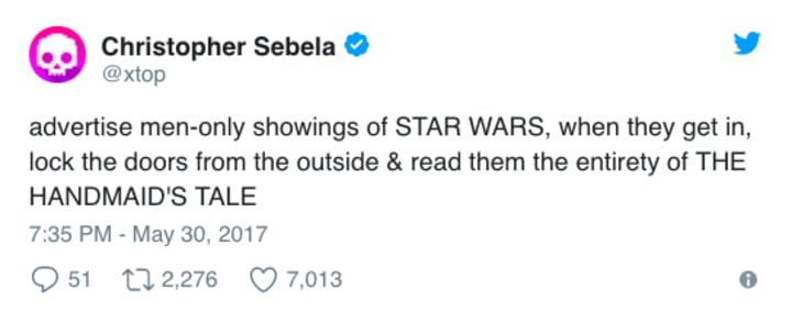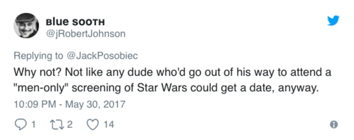 With a misguided "eye for an eye" mentality, some are calling for men-only screening of the next Star Wars film, #TheLastJedi. The campaign has been notably spearheaded by Jack Posobiec, who, if you remember, was that outspoken a$$hole who told us all to boycott the Star Wars franchise for its dilution of "white power."