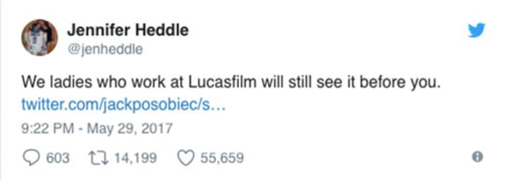 After dropping his aversion to Disney's intergalactic adventure series, Posobiec has called for a whole week of men-only screenings for The Last Jedi to "make up" for Wonder Woman. With the comment rightly sparking outrage, Jennifer Heddle, executive editor for fiction at Lucasfilm, was quick to slice down his idea with her lightsaber: