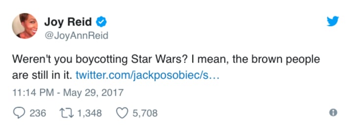 Posobiec was outraged about the multicultural cast of The Force Awakens in 2015, but is clearly looking forward to seeing The Last Jedi and his hypothetical men-only screening. Hmmm, it doesn't really add up when you consider that The Last Jedi contains fewer caucasian actors thanks to Harrison Ford's departure: