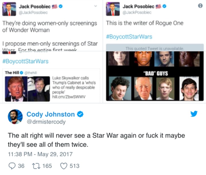 With both Wonder Woman and Star Wars tipped to be two of 2017's biggest hitters, I'm not sure the loss of Posobiec's ticket sales will dent the egos of #RianJohnson and the rest of the crew too much.