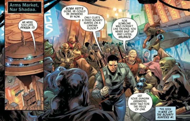 During the events of the aforementioned comic, bounty hunter Beilert Valance races through the Arms Market of Naar Shadaa (also known as "Smuggler's Moon"), and we see an arms dealer offer a "two for one" deal on the grenades, specifically calling them Gungan grenades. Given how effective they were during the battle, it's easy to understand why they would be sought by others as an effective weapon, but what's not so easy to understand, is just how they got there.