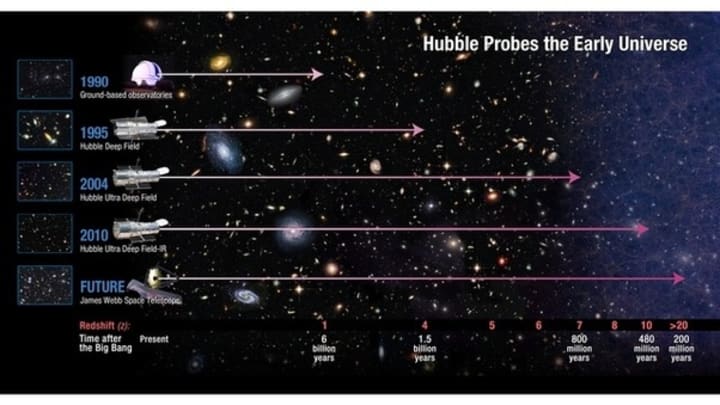 The galaxies we're seeing today existed about a billion years after the Big Bang. So to kind of translate that that's about 13 billion years ago from our present day. And in order to observe these galaxies, accounting for redshift is super important. Light is all getting stretched and shifted to longer and longer wavelengths.