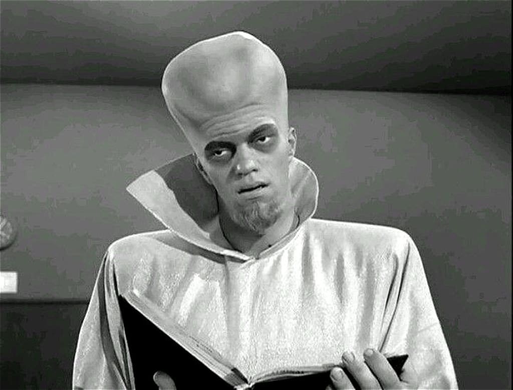 Sounds familiar, correct? An old episode of the haunted television classic "The Twilight Zone," an episode starring James Bond actor, the late Richard Kiel as a hugely tall, robe-wearing, big-headed alien "Kanamit" who speaks telepathically, is called "To Serve Man" (Episode 89, Season 3, 1962). And How!