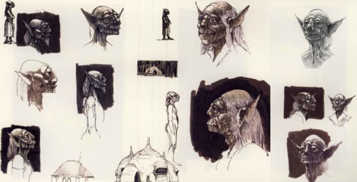 Sometimes the creation of the look of a certain character was a collaboration between more than one person: one artist would sketch something out and another one would use this as an inspiration and build upon and refine it. One such an example is the figure of Yoda, who was originally called Minch and sketched by Joe Johnston as a kind of a garden gnome. McQuarrie used this idea and refined it into something that looked more like the Jedi Master we see in The Empire Strikes Back.