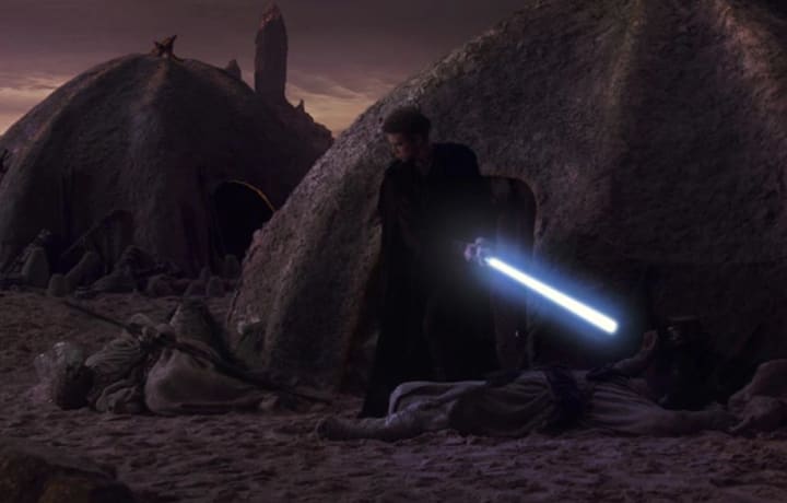 We get what’s going on here. Anakin is committing an atrocious act (and one that foreshadows what he will do to the Younglings). He has given into his rage, and in this moment he is powerful. He is tasting the dark side. It is so well done. It is also an extremely dark narrative choice— arguably as dark as it gets in Star Wars to have a protagonist kill an entire tribe of people. The Sand People aren’t evil. They are simply a different culture. Yet Anakin slaughters them all indiscriminately.