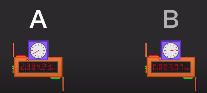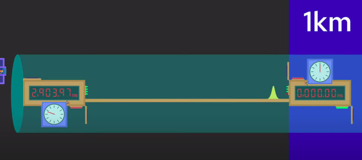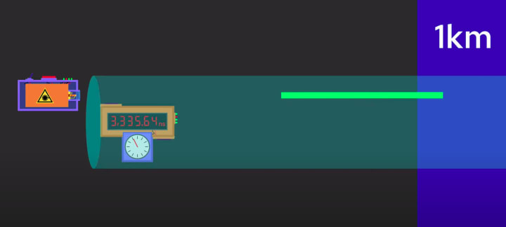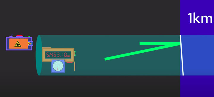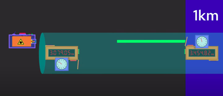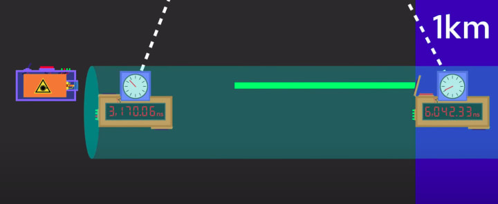 Okay, so you need two clocks, one at the laser and one at the end, which stops automatically when it detects the laser light. But now, how do you make sure your two clocks are synchronized?