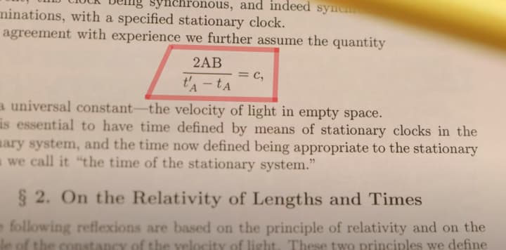 He spends the first couple of pages on the problem of synchronizing clocks at different locations A and B. And he says there is no way that we can meaningfully compare the times they measure unless we established by definition that the time required by light to travel from to B equals the time it