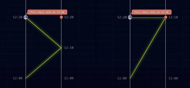 minutes to get there and the reply came back instantaneously. There's no way we could tell the difference between these two scenarios.