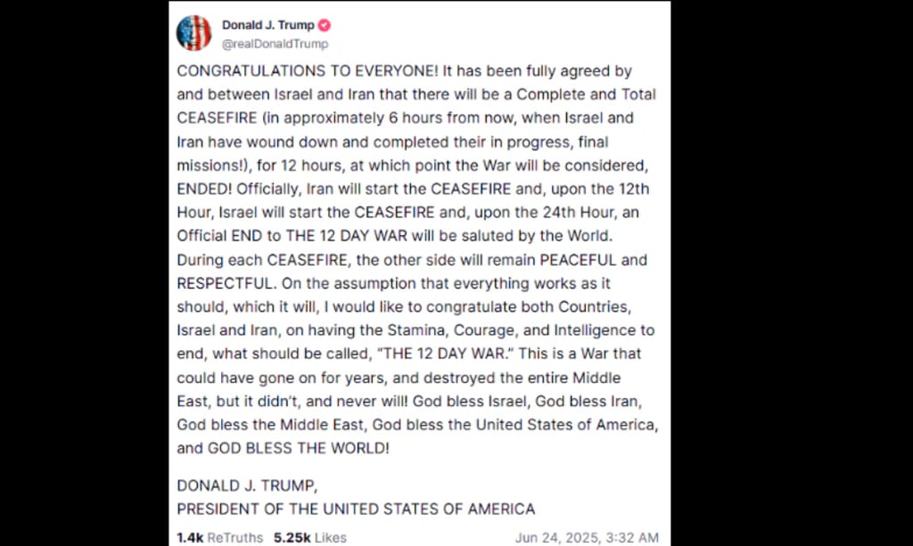 After nearly two weeks of escalating violence between Israel and Iran that brought the Middle East to the brink of a regional war, former U.S. President Donald J. Trump announced a ceasefire in dramatic fashion, taking to social media with a bold declaration.