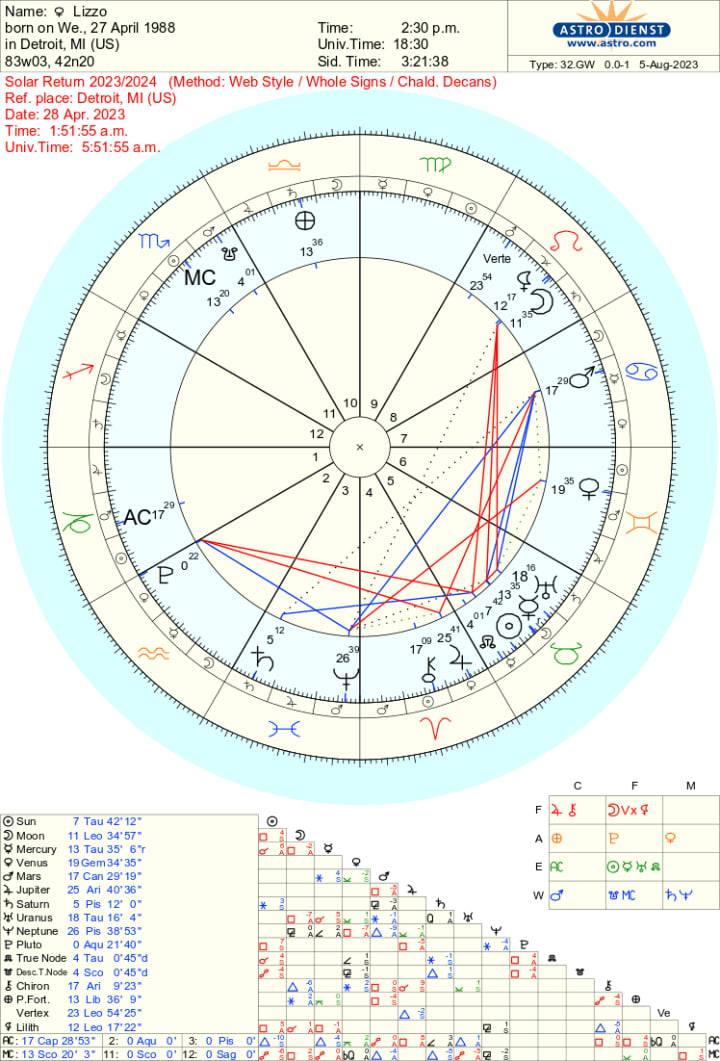 Furthermore, a very quick glance at Lizzo's Solar Return shows a Leo Moon (her profected ruler) in the 8th house, overlapping her natal Ascendant. The Moon is square the Sun, making for a climatic year. Meanwhile, the 12th house (Sagittarius) in the Solar Return chart is ruled by Jupiter, making it her profected ruler, causing the Jupiter transit to be all the more significant, especially regarding 12th house themes. The Solar Return 10th house (Libra) of career is ruled by Venus, which located in the 6th house, is not in very good condition. In other words, the Solar Return also emphasizes the 8th (debt, taxes, law suits, other people's money) and 12th (hidden enemies, isolation, self-undoing) house themes that are already highlighted.