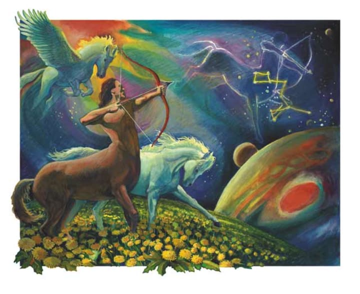 The Moon (our subconscious needs and emotions) in Sagittarius is similar, but taken to a different level. A mutable fire sign ruled by the planet Jupiter (philosophy, faith) is represented by the centaur or archer. Half-man, and half-horse, this sign also has a certain duality to it. Sagittarius possesses both the friendliness, intelligence and civility of a humane sign, and the wild, untamed nature of a bestial sign. In it's bestial form, Sagittarius can be driven by base instincts, a need to be free and have fun, but the bow and arrow it holds is aimed towards transcendence, or true freedom, freedom from the constraints of the material world. Sagittarius represents the search for meaning, truth and coherence in a world full of chaos and falsehoods. It's search for knowledge is more driven by a search for religion or ideology than facts for it's own sake. It's search for knowledge is always driven by an emotional purpose.