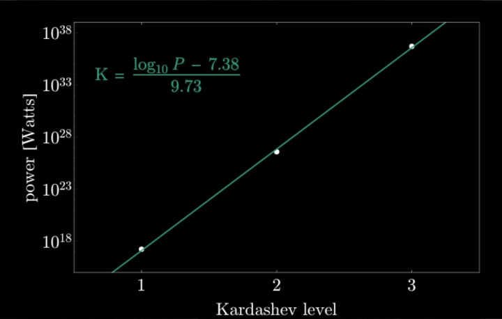 Well, it was Carl Sagan who extended Kardashev's idea to a continuous scale by noting that the energy levels are logarithmically uniformly distributed and this one can fit a straight line through the log of these three power levels.