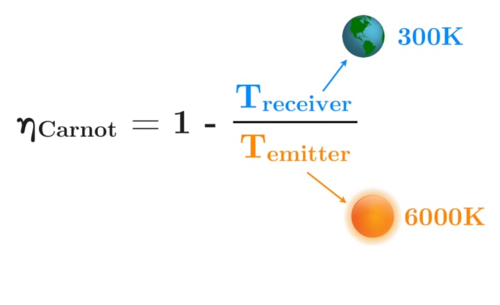 that's the Earth to the Sun. The so-called Carnot efficiency of this system would be at best 95%. We could never do better than that and you might say no worries I'll just build a giant solar cell farm in space and beam the energy back to the earth but even that has some problems.