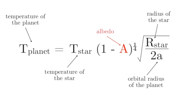 Using the Stefan-Boltzmann law one can show that a planet's temperature approximately equals this, where I've labelled here the various terms for you. The albedo term is the key here. That's how much light is reflected into space without ever being absorbed by the planet.