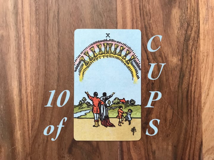 The 10 of Cups: Awww look how happy this scene looks! The energy of this card is like going back to Woodstock Festival, filled with peace signs and hugs all round. We’ve spent our time joyfully creating this small universe, and now it’s time for us to lovingly share it with you, like parents creating the best environment for their children, and then greeting them to the world! Everything and everyone around us is divinely complementing us to further enhance the loving energies around, supporting one another to grow. All is abundantly whole, like a juicy peach that you just want to squeeze and eat up. Don't worry, be happy, and then you'll get more happy... which attracts more happy... which then brings along some more happy... amirite?