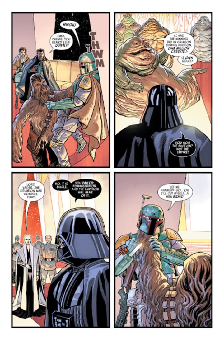 Star Wars: War of the Bounty Hunters #3, written by Charles Soule, illustrated by Luke Ross, and featuring a cover by Steve McNiven, sees the Hutts place the winning bid for the frozen Solo when he is being auctioned off by the crime syndicate Crimson Dawn. However, Darth Vader crashes the party looking to claim Solo for himself and initiates a fight with Qi'ra. Chewbacca and Leia are also present, clearly looking for their friend and love interest back, and will do pretty much anything to achieve this, so when Chewie ends up face to face with Boba, it's no surprise things get heated.