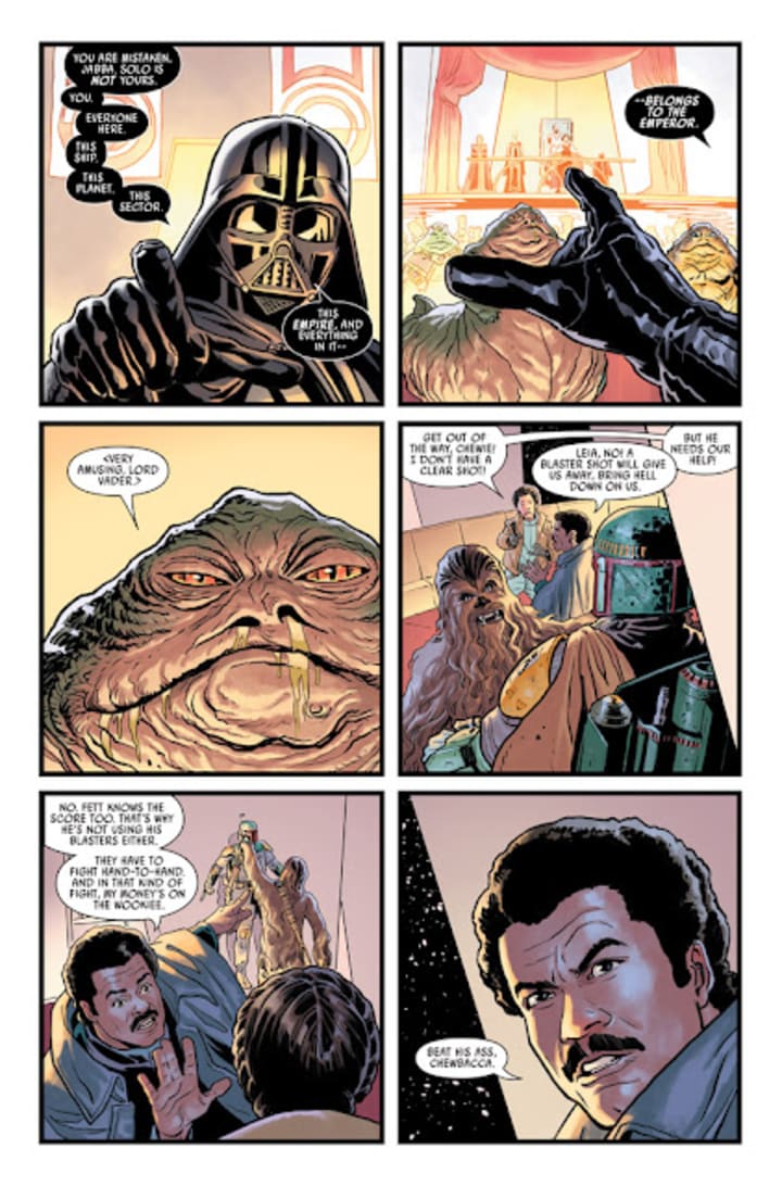This attempt at a warning only serves to provide Chewbacca with further motivation and so he attacks Boba, and proceeds to choke the life from him. Interestingly, this isn't the first time Chewie has gone up against a bounty hunter in recent content, as he fought Beilert Valance in Bounty Hunters #13, showing off his immense strength. With it being established Wookiees can effortlessly remove an enemies limbs, perhaps Boba should have been a little more apprehensive at the thought of initiating a fight with Chewie. This also adds an extra level of depth to their meeting in Return of the Jedi, as Boba would no doubt have been more nervous at the thought of another round with Chewie, especially since Lando Calrissian basically gives him permission to end the bounty hunter during their first fight. This encounter could also, potentially, explain Boba's lackluster performance during the events of Return of the Jedi. Knowing he was unlikely to survive another encounter with Chewie, it could have thrown him off his game, resulting in his very comedic defeat.