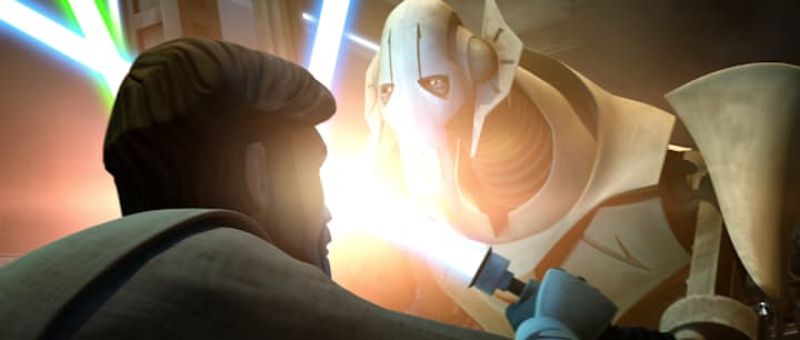 Even before the Clone Wars, Grievous had military and combat experience on his home planet Kalee. There he was both a fearsome warrior and warlord. He gained knowledge of battle tactics and warfare before being noticed by Count Dooku and becoming the general that would lead the Separatist armies. Despite his clear lack of control when it comes to destroying his own battle droids it is shown that he is capable of seeing the bigger picture of the war. In The Clone Wars Season 3 Episode 2 “ARC Troopers” we see a conversation between Grievous and Asajj Ventress during their attack on Kamino. While Ventress questions why they don’t just destroy the clone DNA, Grievous is able to point out that the DNA could unlock new possibilities for the Separatists, proving he is more than just a saber swinging lunatic with a vendetta out for the Jedi. He is able to make smart strategic moves with the future of the Separatist in mind.