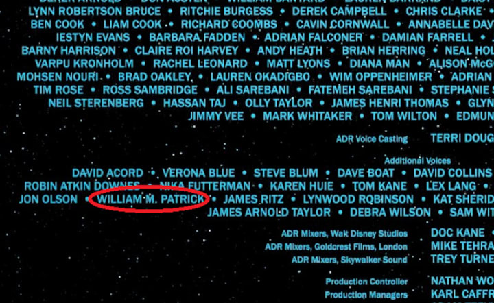 Under the name of William M. Patrick, Hamill made a voice-cameo appearance in Han Solo's origin movie but his actual role was never revealed. One may speculate that he voiced one of Enfys Nest's Cloud Riders, but there was no confirmation. Similarly, in Rogue One, William M. Patrick appeared on the credits as one of the "additional voices". Given Hamill's superb voice acting abilities, there could be no telling as to which character he voiced. While some believe that he was the voice of the Yavin base intercom, others took a step further and surmise that he voiced the disturbingly-weird mind-reader Bor Gullet at Saw Gerrera's hideout.