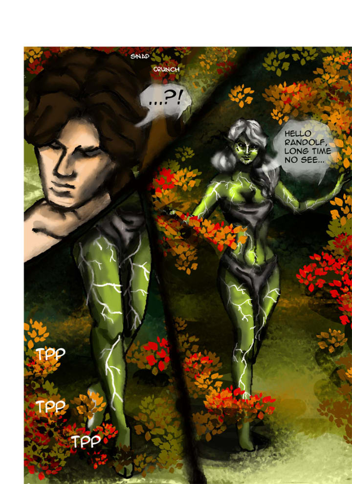 It was then a woman appeared suddenly, stepping out from the thicket. She was of slim build, but the energy she gave off told Klara that this was a creature not to be trifled with. The woman had skin the color of fresh grass with delicate silver vine-like veins. Her body was barely covered by the simple loin cloth and wrapping on her chest. When she stepped out of the shadows, her silver hair caught the sunlight and shimmered, unlike her eyes which were black as night.