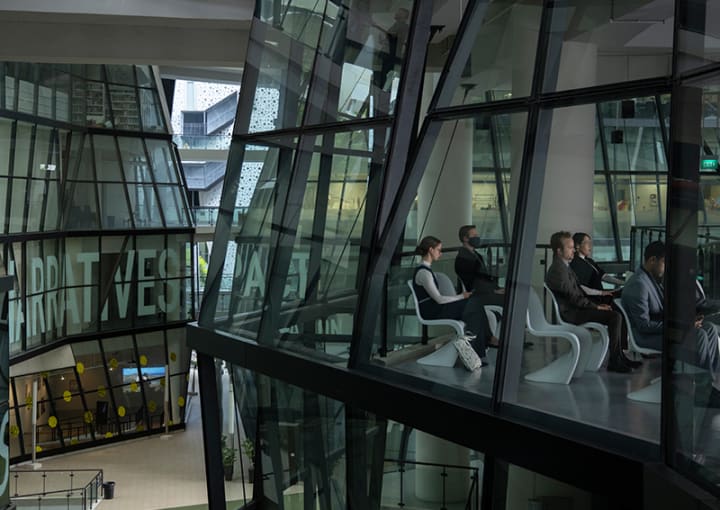 Also in the first episode, Caleb attends a job interview at a building consisting of faceted glass walls and irregular windows with black panels. The amazingly-designed campus of this arts tertiary institution comprises six 7-storey buildings linked by skybridges and an atrium. In episode three, “The Absence of Field,” Caleb and Dolores walk by the striking campus again, with the college’s “Expression” and “Collaboration” signs prominently seen above them.