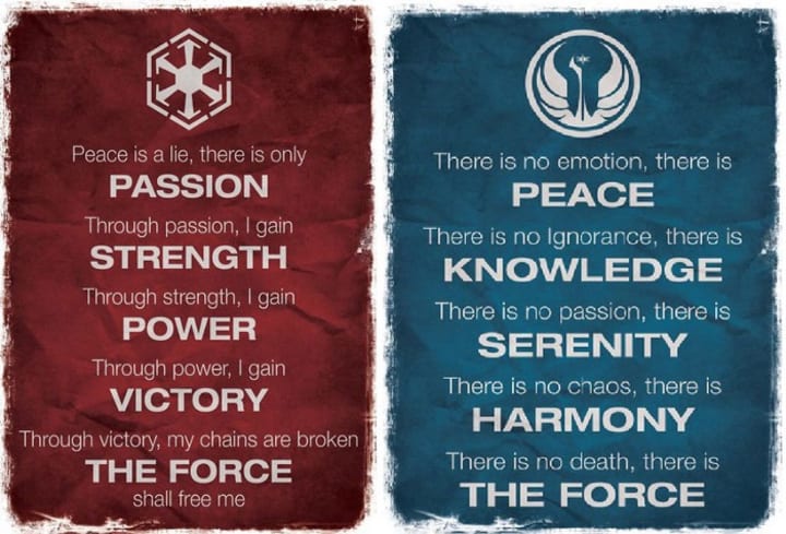 The codes of the Sith and the Jedi are similar to some teachings in real life. The philosophical differences in their ideologies are more about the mindset of people than they are anything else. If you look at their codes, the Jedi believed that dealing with life in a manner that is calm, cool, and mindful as they dealt with problems was the way. The Sith Lords felt that passion lead to strength, strength to power, power to victory, and through victory they attained freedom through the force. The “Force” was their one true power as they both believed that it would ultimately be their salvation.