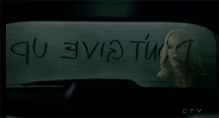39:15 - Someone has scrawled "Don't Give Up" on her car...How creepy is that, and how filthy is your car!? I know she is a busy lady, but jeez get it washed woman. Also turns out Scully fudged Sveta's results and she really has got alien DNA in her. I spy a cover up.