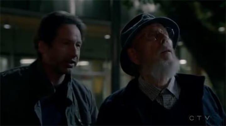 The premise? Well there was the time that Cerys Matthews sang about "Mulder and Scully" in her titular 1998 song of the same name. There was The Simpsons where Mr. Burns and The Late, Great Leonard Nemoy spoofed it. Apart from that; from what I can gather, two suits (not the cast of Suits) check out weird stuff. It stars David Duchovny, a squinty David Schwimmer / Patrick Dempsey hybrid; the other is Gillian Anderson, a fiery red head from Hannibal. There was also a film, The X-Files: I want to Believe (2008), which for some bizarre reason starred Billy Connolly and everyone says it was awful. The rest, much like the revival, is a mystery. So Season 10, Episode 1 'My Struggle'.