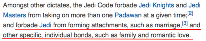 Now, something that would make more sense is if Obi-Wan had a wife and child and that kid had Rey, making Obi-Wan her grandfather. But this goes against the Jedi Code, which explicitly prohibits Jedi from attachments or marriage.