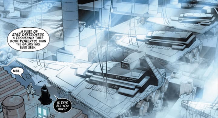 In the second arc of the story, Vader was hunted down by one of the Emperor’s assassins, Ochi of Bestoon, and was later taken to the planet Exegol, both introduced in The Rise of Skywalker. There we saw the Emperor's fleet from the film, still in the very early stages of production. Palpatine also had dozens of Sith Cultists under his command as well, and been creating creatures and other horrible monstrosities. While not said directly, it is presumably connected to the experiments of Plagueis, who manipulated the midi-chlorians to create…life. While this is retroactive, it definitely shows that Palpatine was planning his forces on Exegol for a long time, and that they didn't just come out of nowhere.