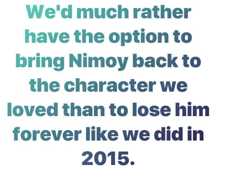 Regardless of how much the death of Spock pained us in 1982, we were glad to see him in return in The Search for Spock. We'd much rather have the option to bring Nimoy back to the character we loved than to lose him forever like we did in 2015.