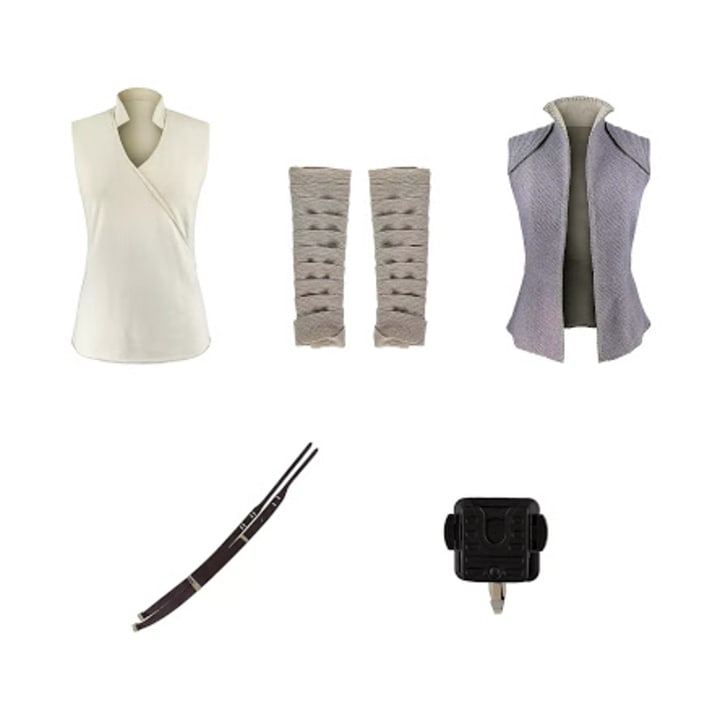 The Dark Side and Light Side Collections include a tunic, belt, robe, and lightsaber belt clip, and the Resistance Collection includes a tunic, vest, belt, armbands, belt, and belt clip (pictured below). Items in the collection can be purchased together or separately and range in price.