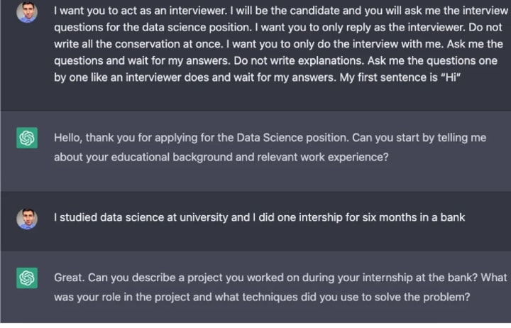 Say you want to practice for a job interview. By telling ChatGPT to “act as hiring manager” and adding more details to the prompt, you’ll be able to simulate a job interview for any position.