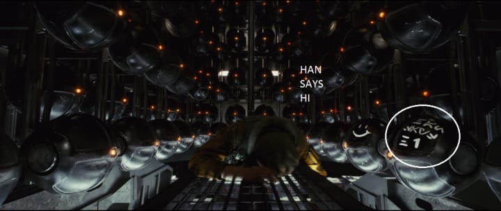 Reddit user Stalemate9 must have been watching Episode VIII: The Last Jedi extremely closely to discover this reference to a fan-favorite smuggler and captain of the Millennium Falcon; Han Solo. The Easter Egg takes the form of a message, written to the villainous First Order, much in the style of World War II pilots who would add similar messages to their ordinance and paint their planes to look like fearsome animals. The message (which can be seen below), written on the side of a bomb in the Star Wars alphabet, Aurebesh, reads "Han says hi". Clearly the Resistance has been informed of Han Solo's death at the hands of his son, Kylo Ren, during the Battle of Starkiller Base. Given Rey and Finn's instant recognition of the legend of Han Solo, as both General and smuggler, when they meet him in Force Awakens, it is little surprise that the crew of a Resistance bomber would know of Han and that he would be a hero to them. It is also unsurprising that these largely guerilla fighters would want a small amount of payback against the First Order, and downing a dreadnaught in Han's name would certainly help satisfy that thirst for vengeance.