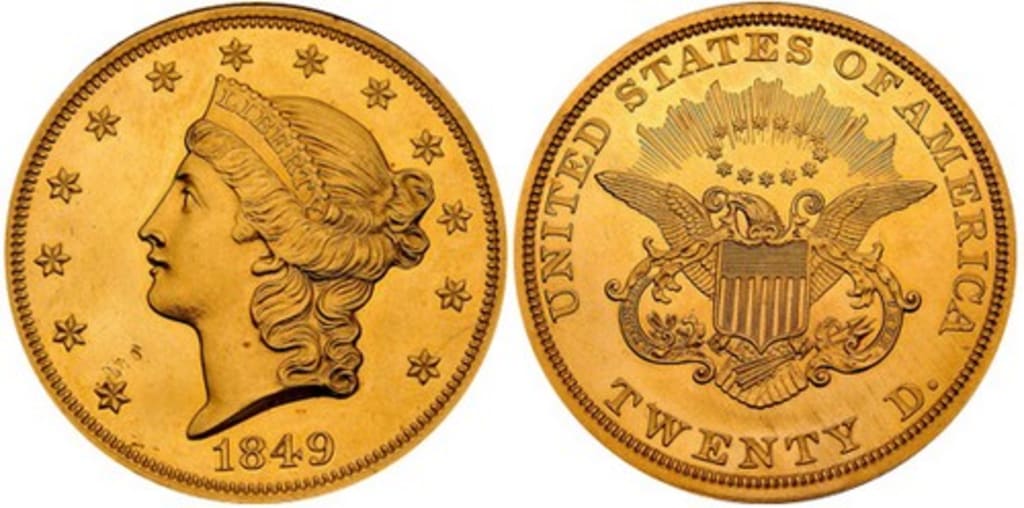 With only one specimen remaining, this coin is likely the most valuable and rare coin in US history. It is one of two trial pieces that heralded the era of the $20 coins, also known as Double Eagles. The coin was minted in 1850, despite the fact that it bears the year 1849. Its release coincided with the start of the California gold rush. The existing specimen of this coin is now housed in the Smithsonian's National Numismatic Collections. It is worth nearly $20 million.